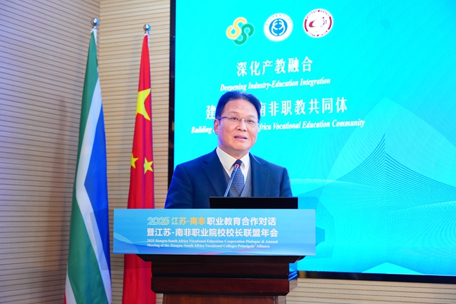 谢永华在致辞中对来宾表示热烈欢迎。他表示,我校作为江苏—南非职业院校校长联盟理事长单位,多年来始终致力于落实习近平主席关于中非教育合作的重要倡议。过去一年双方合作取得了实质性进展:一是平台能级持续跃升,联盟的“朋友圈”持续扩大;二是合作内涵深度拓展,合作从师生交流扩展至课程共建、标准共研,根基愈加深厚;三是人文交流焕新出彩,通过“未来非洲”青年营、职业技能竞赛等多元化活动,中南青年互动频次持续提高。他指出,我校与联盟同频共振,取得多项里程碑成果:“留学江苏政府奖学金”南非专项奖启动,“中国—南非国际奖学金项目”首批百余名学生来苏。他表示,今年是中南关系提升为“新时代全方位战略合作伙伴关系”的开局之年,江苏与南非的职业教育合作必将以此为契机谱写新时代中南命运共同体的新篇章。