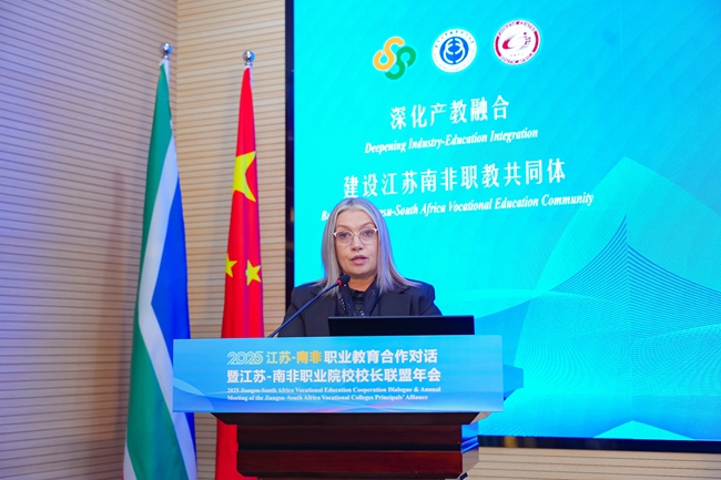 施蕴玉在致辞中,首先祝贺了本次江苏—南非职业教育合作对话会暨江苏-南非职业院校校长联盟年会成功举办。她表示,联盟成立以来,江苏与南非的职业教育交流合作不断走深走实,结出了一批实打实的成果,包括南工南非分校的成立、师生交流项目的深化及“留学江苏”项目南非学生规模的持续扩大。针对未来一段时期的工作,她提出了三点合作方向:一是聚焦技能培养,围绕产业发展需求,在新能源汽车、智能制造等重点领域提升合作实效;二是强化平台构建,创新合作机制,拓展联合科研与技术共享;三是树立典范标杆,将联盟打造为中非职教合作中“影响力大、获得感强”的示范项目,江苏省教育厅将一如既往支持联盟发展,让更多南非优秀青年有机会来苏深造,为构建高水平中非命运共同体贡献力量。